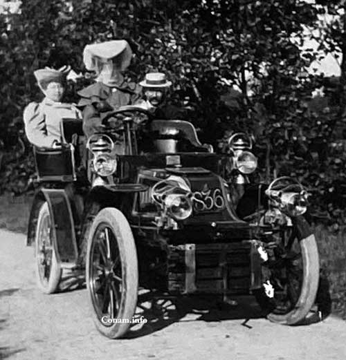 Op 3 september 1898 kreeg Theodorus (Thei) Hubertus Cox uit Roermond Rijksnummer 24 voor zijn Benz Comfortable. De foto is genomen voor het bedrijfspand van Thei Cox op de Godsweerdersingel. Hij zit zelf achter het stuur, naast hem zijn tweede vrouw Agnes Walraven en tegenover hem zijn oudste zoon Harry (Henri).